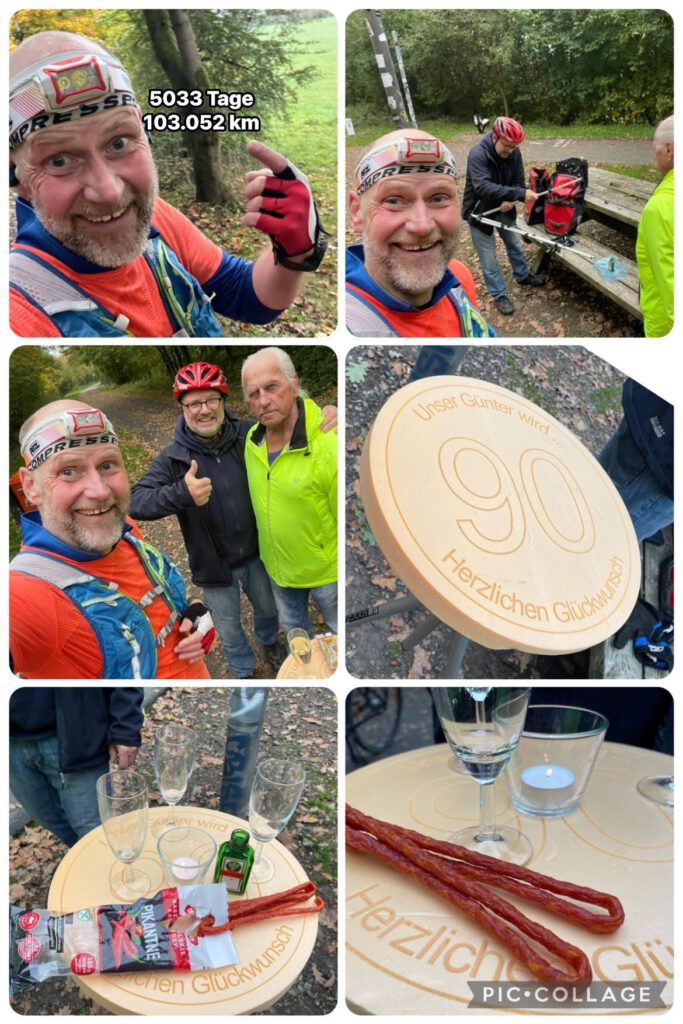 Günter ist heute 90 Jahre jung geworden. Ich sehe ihn fast jeden Tag, wenn er bis kurz hinter Bergisch Born marschiert und wieder zurück. Heute wurde gefeiert. Gary hat einen Tisch gefertigt, Sekt und Kuchen mitgebracht. Günter hatte ein paar Schnäpse und fettige Wurst dabei.