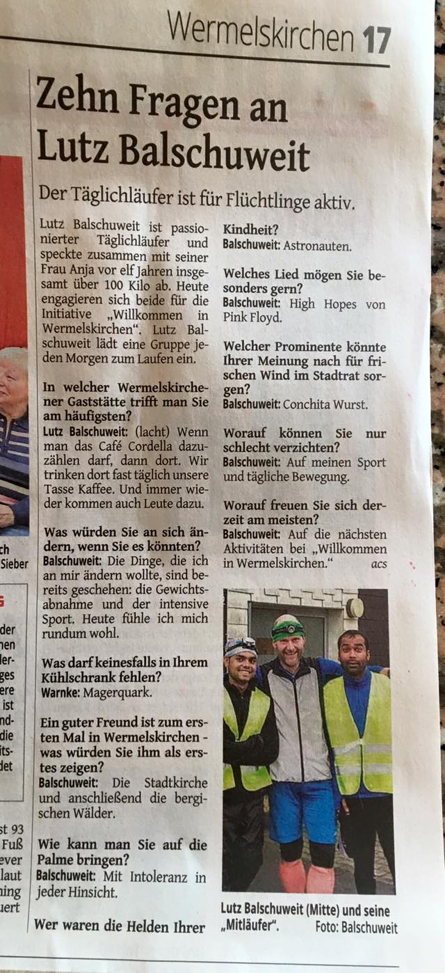 22.01.2016 – Wer­mels­kir­che­ner Gene­ral­an­zei­ger “Lutz Bal­schu­weit läuft mit Flücht­lin­gen” von Anja C.Siebel Run­Wi­th­Re­fu­gees­Wk