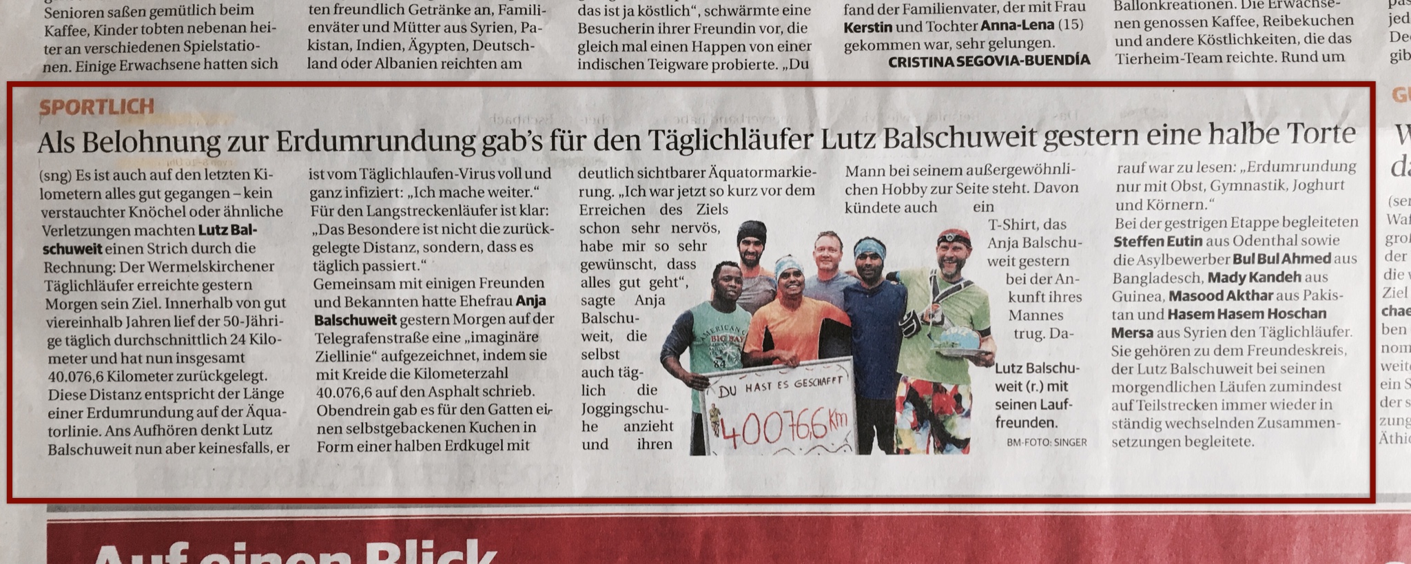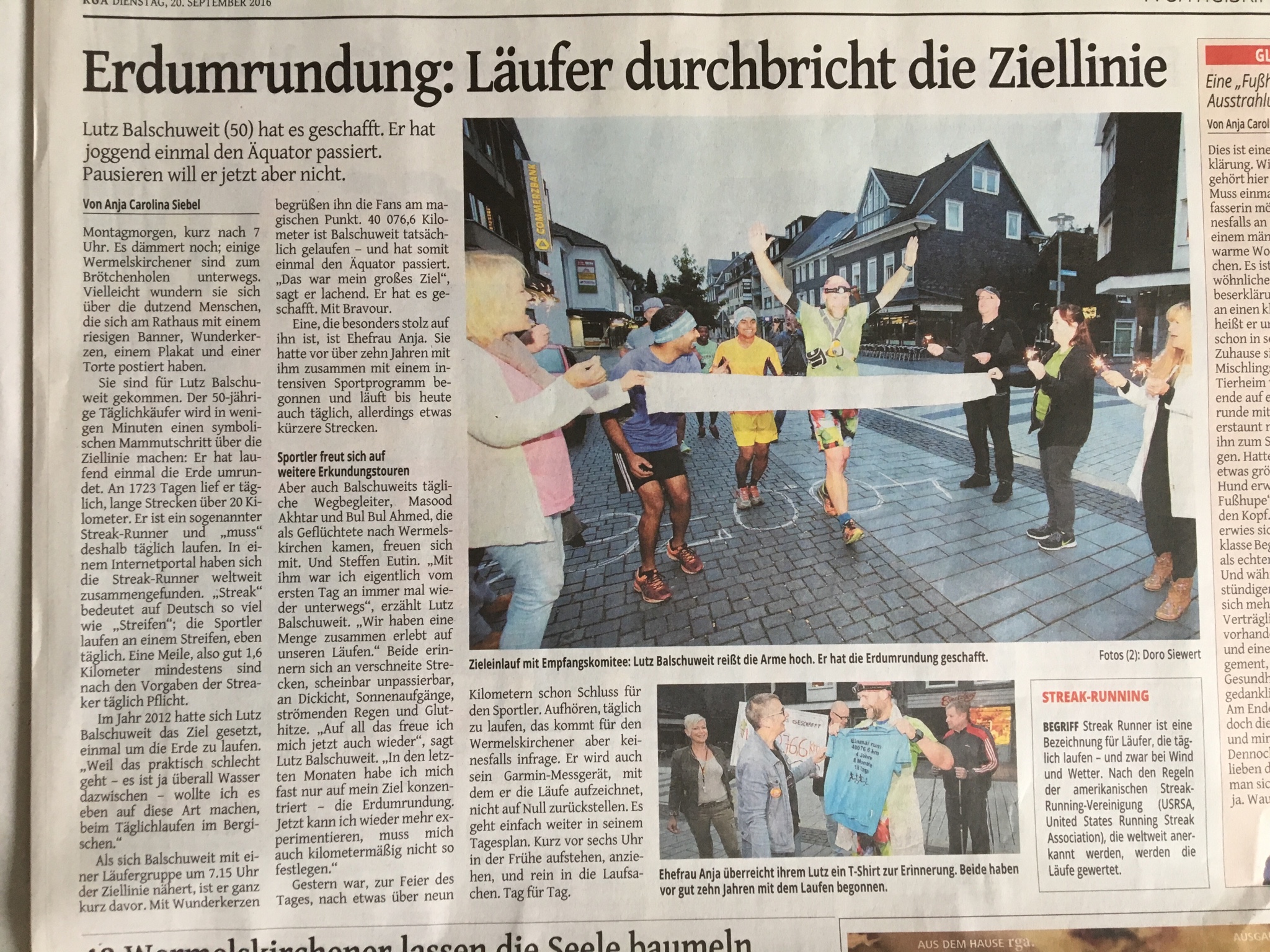 20.09.2016 – Wer­mels­kir­che­ner Gene­ral­an­zei­ger “Erd­um­run­dung: Läu­fer durch­bricht die Ziel­li­nie” Erd­um­run­dung: Läu­fer durch­bricht die Ziel­li­nie